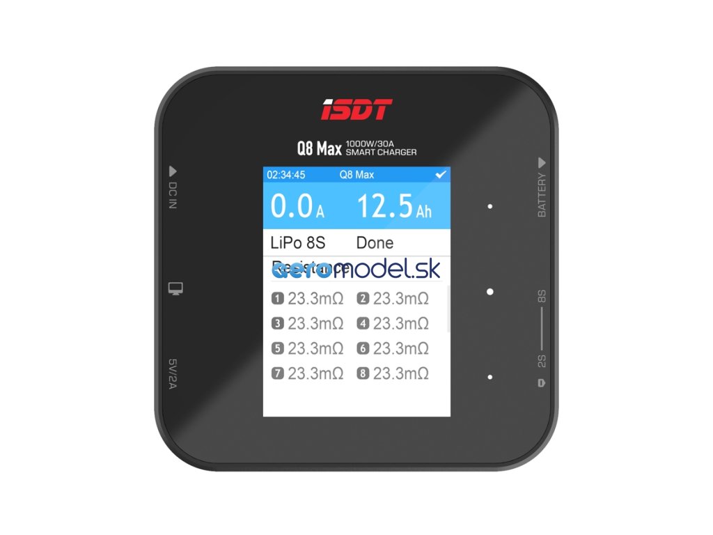 Miniaturní nabíječ ISDT Q8 Max 1000W je vysokovýkonný inteligentní nabíječ s napájením z autobaterie nebo stabilizovaného síťového zdroje a velmi jednoduchou a přehlednou obsluhou. Q8 Maxumožňuje nabíjet a vybíjet běžné typy článků (NiCd, NiMH, LiPo, LiHV, Li-ion, LiFe, Pb), navíc je vybaven vestavěným osmikanálovým balancerem, který zajišťují bezpečné nabíjení lithiových akumulátorů. Nabíječ je vybaven barevným LCD displejem a dotykovými programovacími tlačítky, které vám poskytnou možnost komfortního a velice přehledného nastavování parametrů, řízení a sledování průběhu nabíjení/vybíjení.