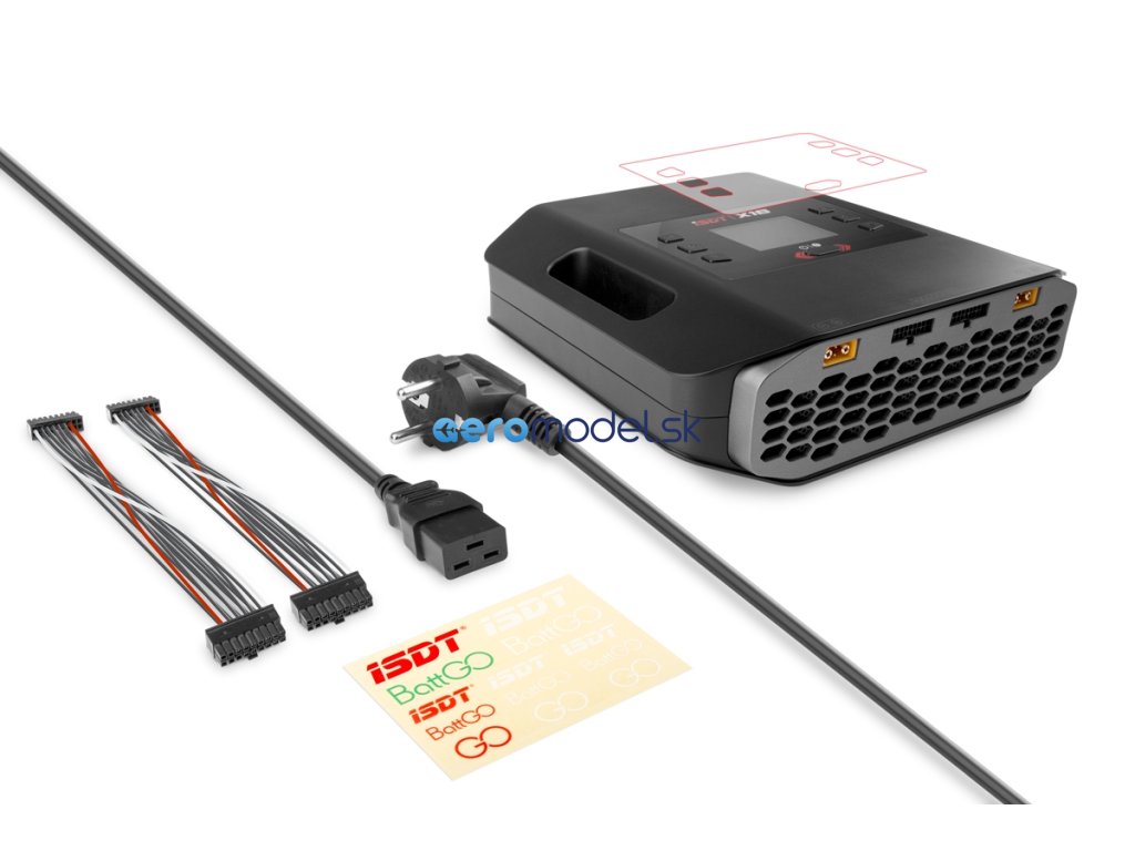 Sada nabíječe obsahuje: nabíječ ISDT X16, síťový kabel, 2 kabely s 18kolíkovými konektory, chránič displeje, návod.