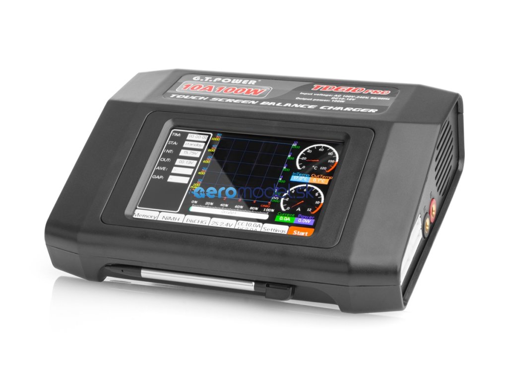G.T. Power TD610 Pro 100W byl konstruován se snahou poskytnout vše potřebné pro nabíjení „pod jednou střechou" včetně síťového zdroje a s komfortní obsluhou pomocí dotykového displeje. TD610 Pro umožňuje nabíjet a vybíjet běžné typy článků (NiCd, NiMH, LiPo, Li-ion, LiFe, LiHV, Pb), navíc je vybaven vestavěným šestikanálovým balancerem, který zajišťuje velmi bezpečné a komfortní nabíjení lithiových akumulátorů. Nechybí zásuvka pro teplotní čidlo a USB port pro aktualizaci firmwaru.