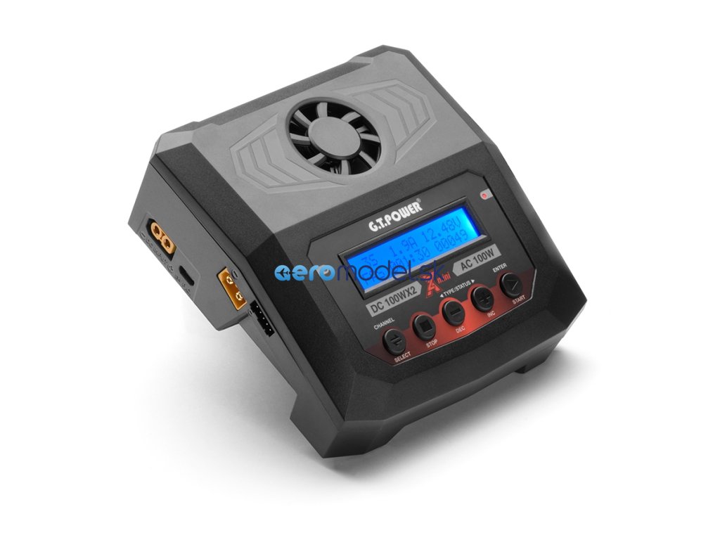 Dvoukanálový nabíječ G.T. POWER X2 mini 2x100W byl konstruován se snahou poskytnout vše potřebné pro nabíjení dvou akumulátorů současně "pod jednou střechou" včetně síťového zdroje a s jednoduchou obsluhou.