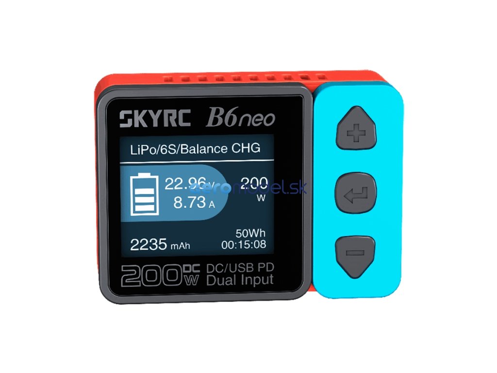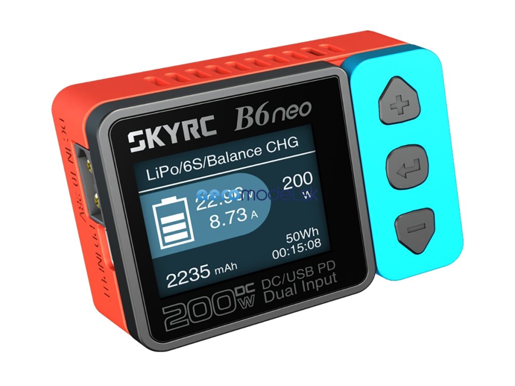 Miniaturní nabíječ SKY RC B6neo 200W byl konstruován se snahou poskytnout vše potřebné pro nabíjení velkými proudy, s jednoduchou obsluhou, při velikosti „na půl dlaně“ nebo „do kapsičky u vesty“. B6neo umožňuje nabíjet a vybíjet běžné typy článků (NiCd, NiMH, Li-poly, Li-ion, Li-Fe, Li-HV, Pb), navíc je vybaven vestavěným šestikanálovým balancerem, který zajišťuje velmi bezpečné a komfortní nabíjení lithiových akumulátorů. Může také pracovat v režimu regulovaného napájecího zdroje s výstupním napětím nastavitelným v rozmezí 5-27 V a proudem 1-10 A.