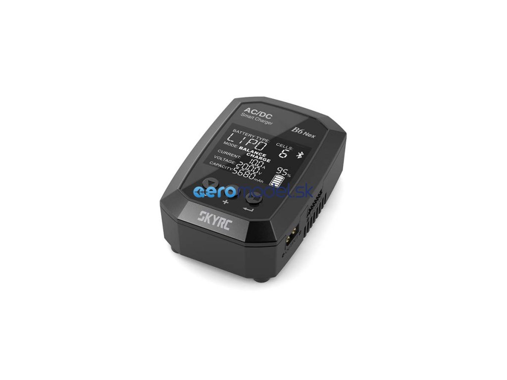 Miniaturní nabíječ B6 Nex 200W byl konstruován se snahou nabídnout inteligentní kapesní nabíječ se síťovým i stejnosměrným napájením s velkým výkonem a velmi jednoduchou a přehlednou obsluhou. B6 Nex umožňuje nabíjet a vybíjet běžné typy článků (NiCd, NiMH, LiPo, LiHV, Li-ion, LiFe, Pb), navíc je vybaven vestavěným šestikanálovým balancerem, který zajišťuje velmi bezpečné nabíjení lithiových akumulátorů. Nabíječ je vybaven Bluetooth 5.0 rozhraním, které vám po připojení k aplikaci SkyCharger nainstalované na vašem smartphonu (iOS i Android) poskytne možnost komfortního a velice přehledného nastavování parametrů, řízení a sledování průběhu nabíjení/vybíjení.