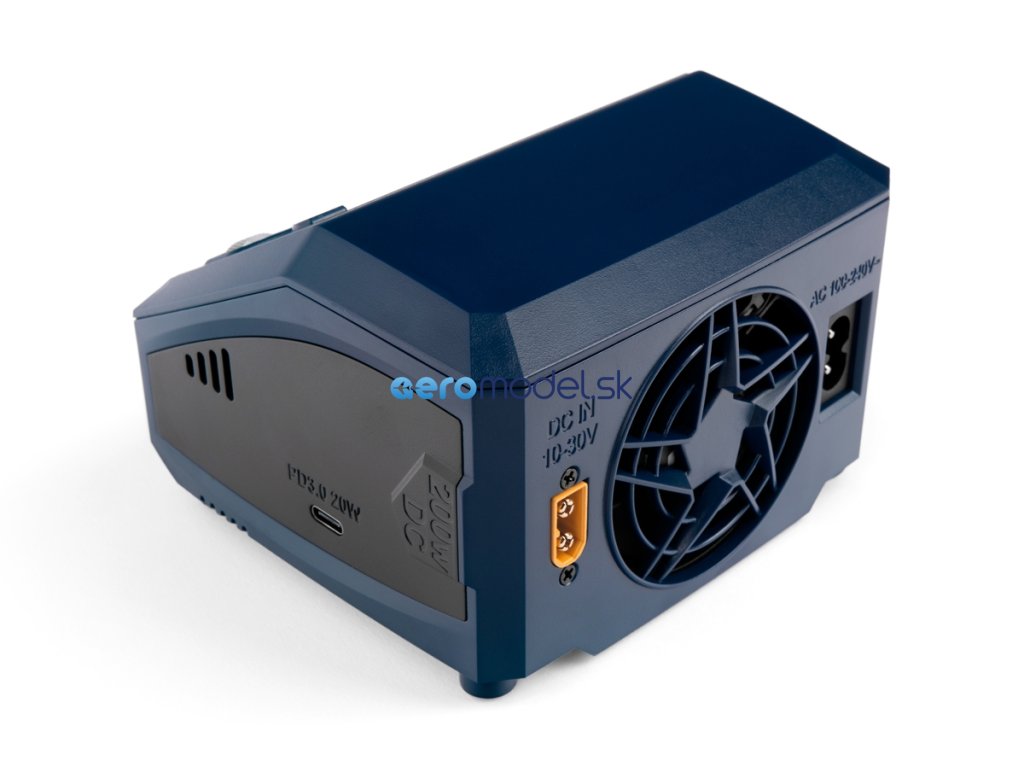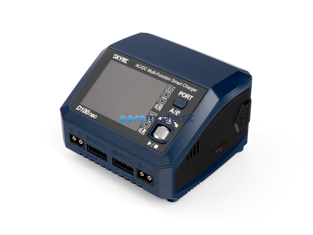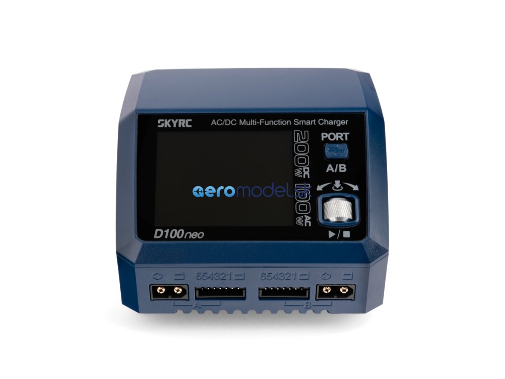 Dvoukanálový nabíječ SKY RC D100neo 200W byl konstruován se snahou poskytnout vše potřebné pro nabíjení dvou akumulátorů velkými proudy současně „pod jednou střechou" včetně síťového zdroje, s jednoduchou obsluhou a možností komunikace s PC s programem SkyCharger. D100neo umožňuje nabíjet a vybíjet běžné typy článků (NiCd, NiMH, Li-poly, Li-ion, Li-Fe, Li-HV, Pb), navíc jsou oba kanály vybaveny vestavěnými šestikanálovými balancery, které zajišťují velmi bezpečné a komfortní nabíjení lithiových akumulátorů.