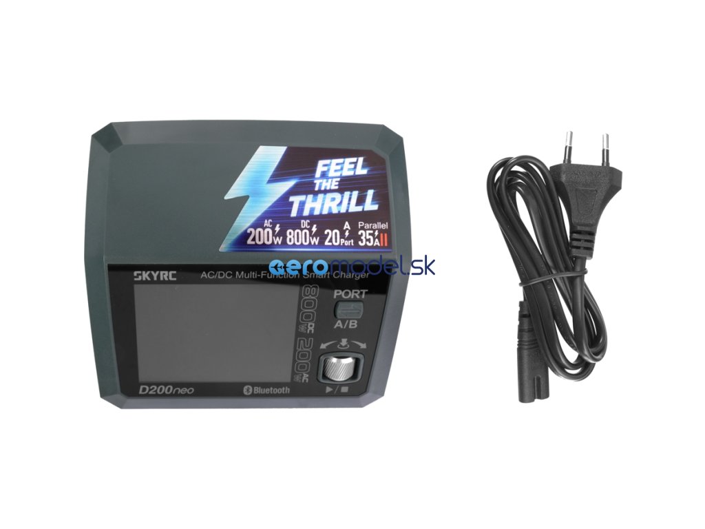 Dvoukanálový nabíječ SKY RC D200neo 800W byl konstruován se snahou poskytnout vše potřebné pro nabíjení dvou akumulátorů velkými proudy současně „pod jednou střechou" včetně síťového zdroje, s jednoduchou obsluhou a možností komunikace s aplikací SkyCharger. D200neo umožňuje nabíjet a vybíjet běžné typy článků (NiCd, NiMH, Li-poly, Li-ion, Li-Fe, Li-HV, Pb), navíc jsou oba kanály vybaveny vestavěnými šestikanálovými balancery, které zajišťují velmi bezpečné a komfortní nabíjení lithiových akumulátorů. Může také pracovat v režimu paralelního nabíjení, kdy oba kanály nabíjejí jeden akumulátor proudem 20-35 A. Při připojení externího vybíječe BD350 potom umožňuje vybíjení proudem až 40 A při max výkonu 350 W.