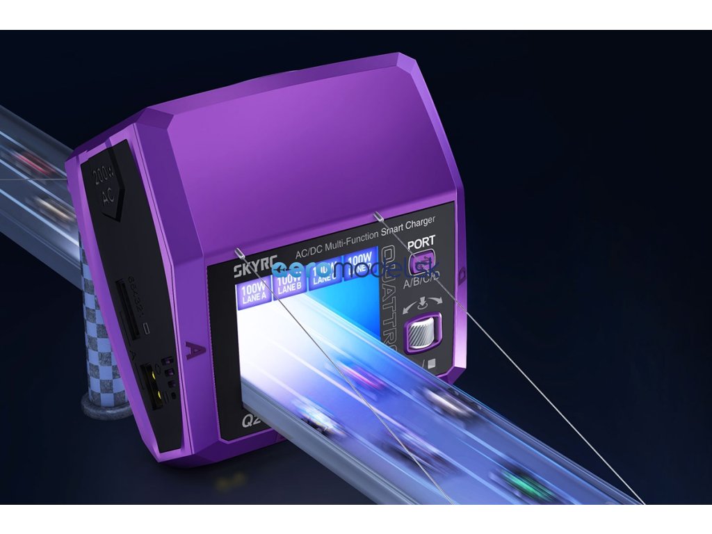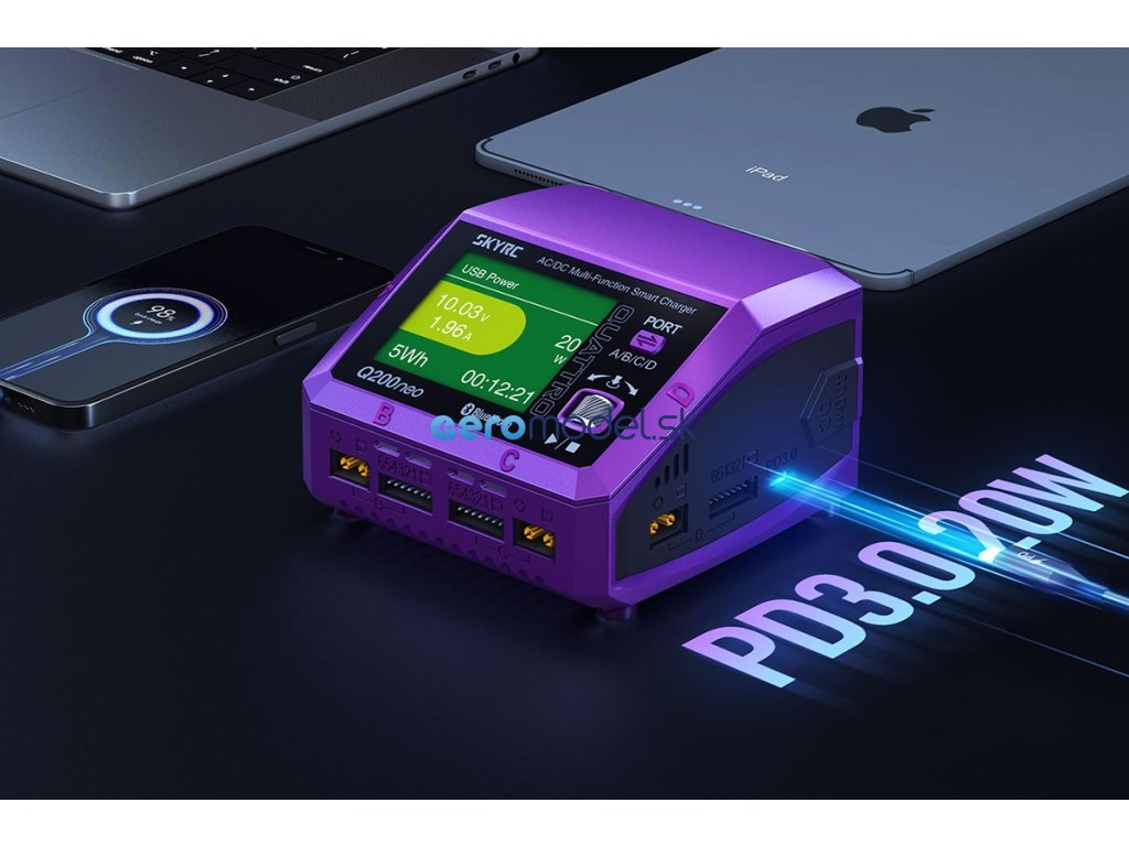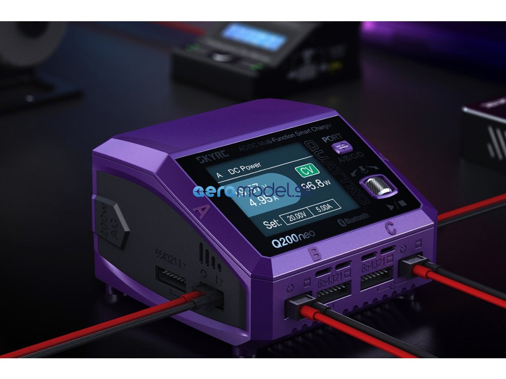 Čtyřkanálový nabíječ SKY RC Q200neo 400W byl konstruován se snahou poskytnout vše potřebné pro nabíjení čtyř akumulátorů proudy současně „pod jednou střechou" včetně síťového zdroje, s jednoduchou obsluhou a možností komunikace s aplikací SkyCharger. Q200neo umožňuje nabíjet a vybíjet běžné typy článků (NiCd, NiMH, Li-poly, Li-ion, Li-Fe, Li-HV, Pb), navíc jsou všechny kanály vybaveny vestavěnými šestikanálovými balancery, které zajišťují velmi bezpečné a komfortní nabíjení lithiových akumulátorů.