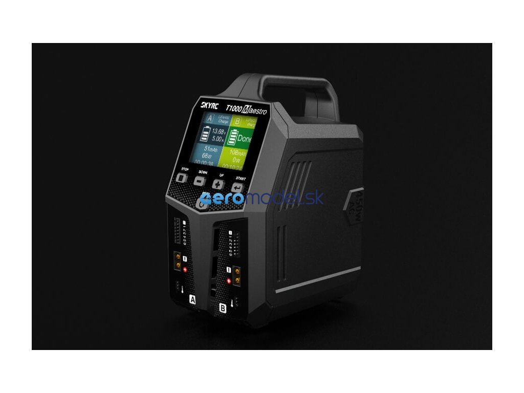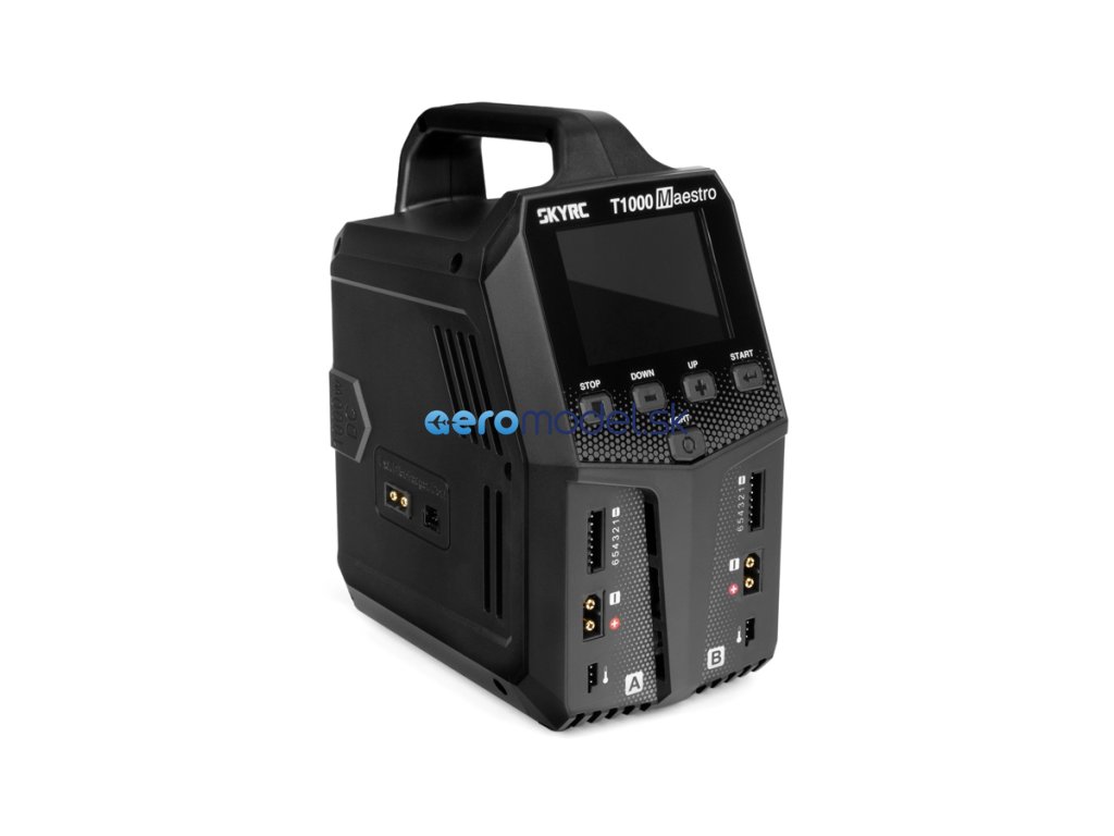 Dvoukanálový nabíječ SKY RC T1000 Maestro 1000W byl konstruován se snahou poskytnout vše potřebné pro nabíjení dvou akumulátorů velkými proudy současně „pod jednou střechou" včetně síťového zdroje a s jednoduchou obsluhou. T1000 umožňuje nabíjet a vybíjet běžné typy článků (NiCd, NiMH, Li-poly, Li-ion, Li-Fe, Li-HV, Pb), navíc jsou oba kanály vybaveny vestavěnými šestikanálovými balancery, které zajišťují velmi bezpečné a komfortní nabíjení lithiových akumulátorů. Může také pracovat v režimu paralelního nabíjení, kdy oba kanály nabíjejí jeden akumulátor proudem 20-35 A. Při připojení externího vybíječe BD350 potom umožňuje vybíjení proudem až 40 A při max výkonu 350 W.