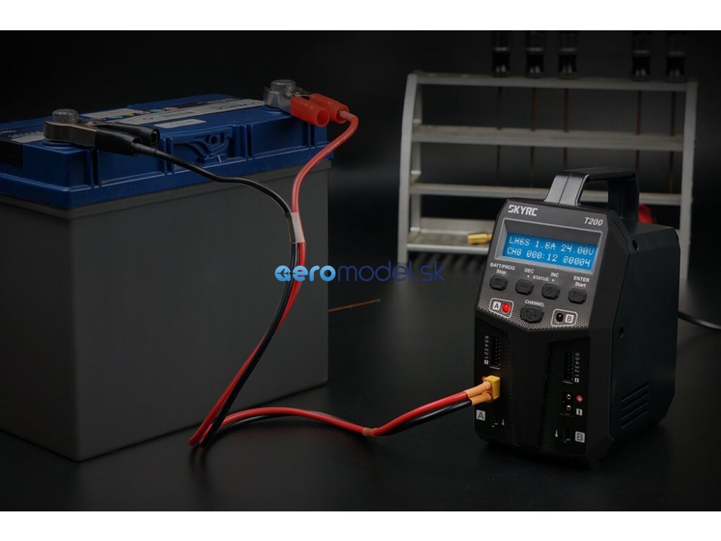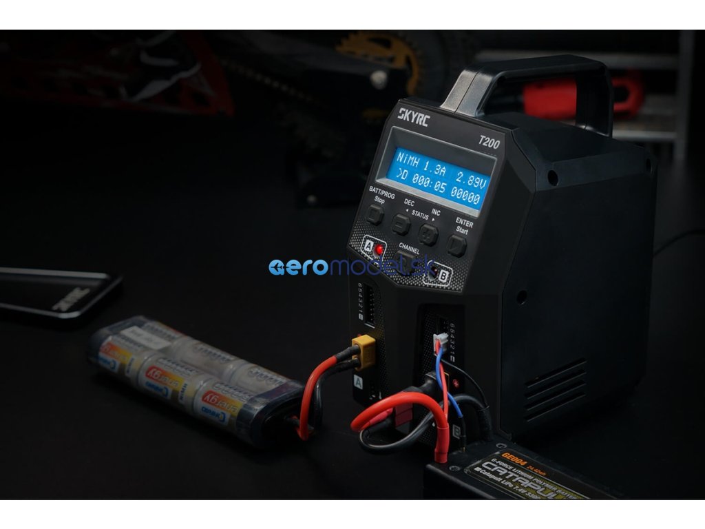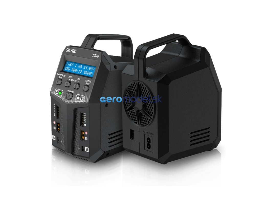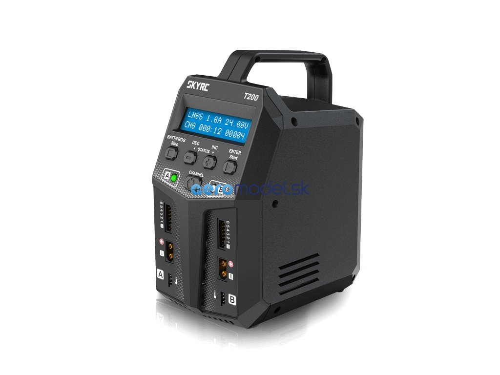 Dvoukanálový nabíječ SKY RC T200 2x100W byl konstruován se snahou poskytnout vše potřebné pro nabíjení dvou akumulátorů současně "pod jednou střechou" včetně síťového zdroje a s jednoduchou obsluhou. Na rozdíl od mnoha konkurenčních přístrojů má T200 stejný výkon při napájení ze sítě i autobaterie, takže se můžete spolehnout, že vždy nabíjíte stejně rychle. Uspořádání "na stojato" zaručuje, že nabíječ ve vaší dílně zabere jen minimální prostor.
