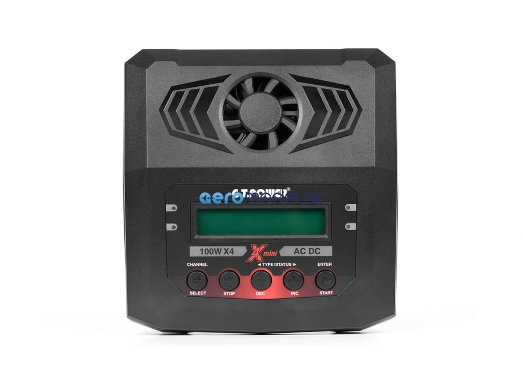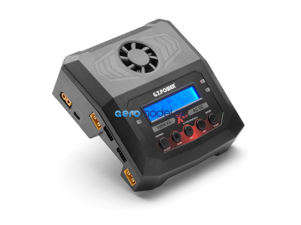 Čtyřkanálový nabíječ G.T. POWER X4 mini 4x100W byl konstruován se snahou poskytnout vše potřebné pro nabíjení až čtyř akumulátorů současně "pod jednou střechou" včetně síťového zdroje a s jednoduchou obsluhou.