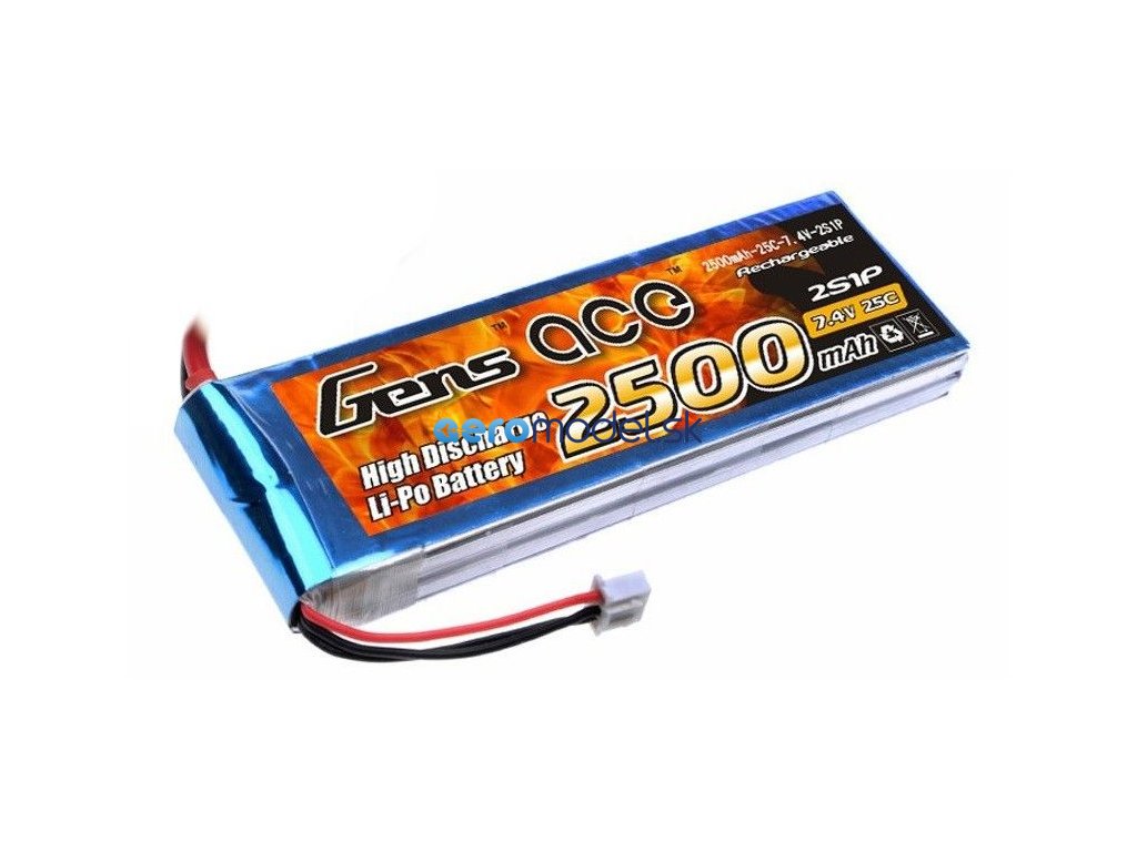 LiPo Gens Ace 2500 mAh 7,4 V 2S1P s vysokým vybíjaním, s maximálnym trvalým vybíjaním 25 ° C. Vhodný pre RC lietadlá, rádiové vysielače.