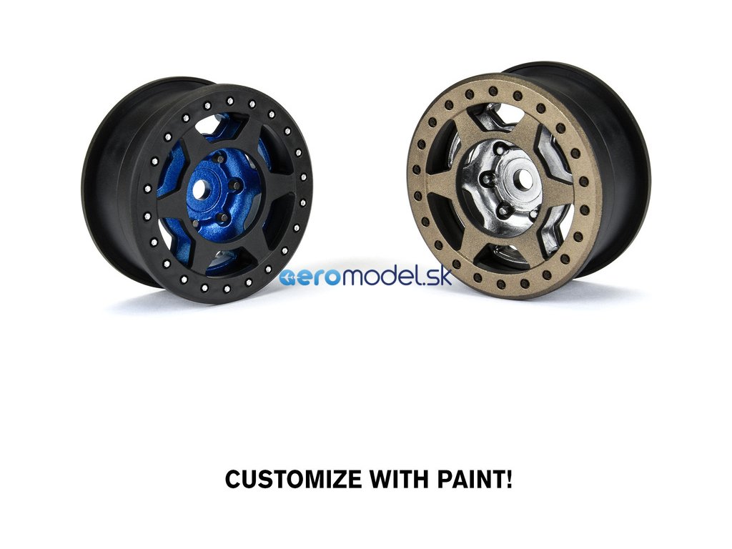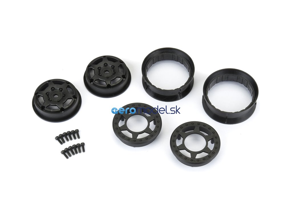 Disky Pro-Line 1.9" Holcomb Crawler Bead-Loc (2 ks), pro RC modely aut Crawler 1:10. Barva černá. Unašeč je šestihran 12 mm. 3-dílná konstrukce pro pneumatiky ProLine 1.9".