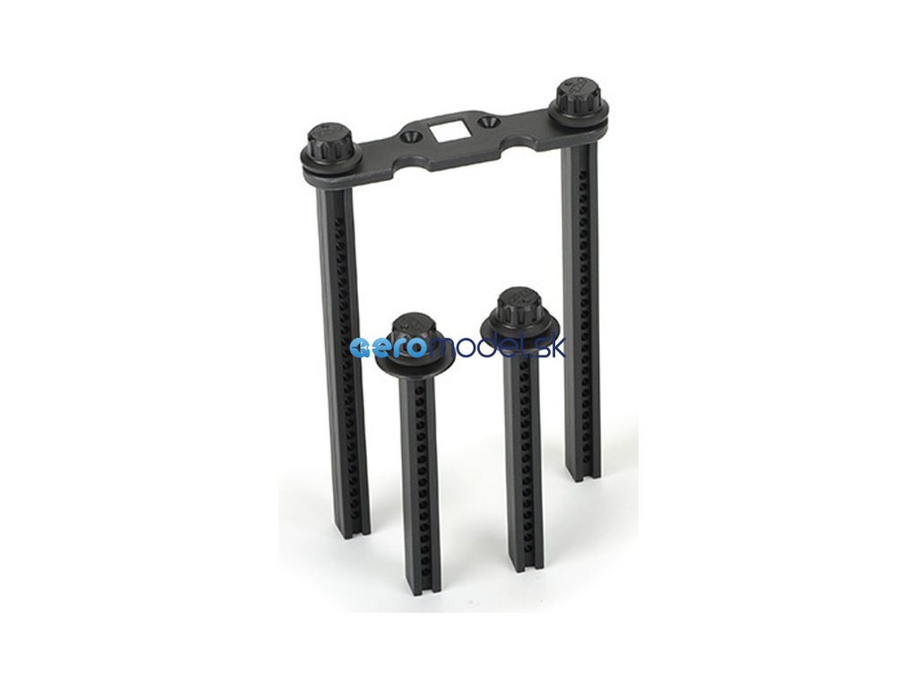 Kompletně nastavitelný držák karosérie Pro-Line 1:8 umožňuje montáž různých typů karosérií (pro Nitro Revo, E-Revo, Summit). Inovativní šroubovací systém upevnění těla (Secure-Loc Cap). Vyrobeno z ultra odolného nylonu.
