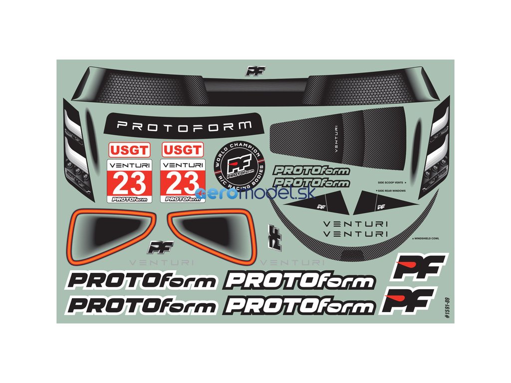 Balení obsahuje ROTOform karosérii 1:10 Venturi GT (190 mm / 0.4 mm), montážní příslušenství, arch samolepek, masku oken, přestříkávací fólie.