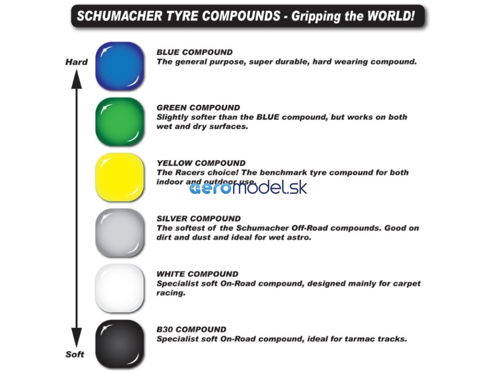 - Stříbrná směs - Nejměkčí z off-road směsí firmy Schumacher. Hodí se pro hlínu a prašné povrchy a především pro mokrý astroturf.