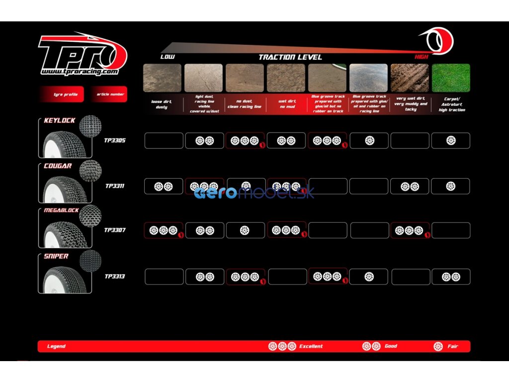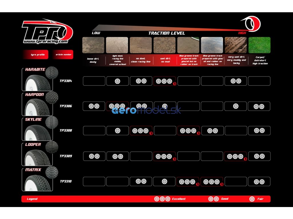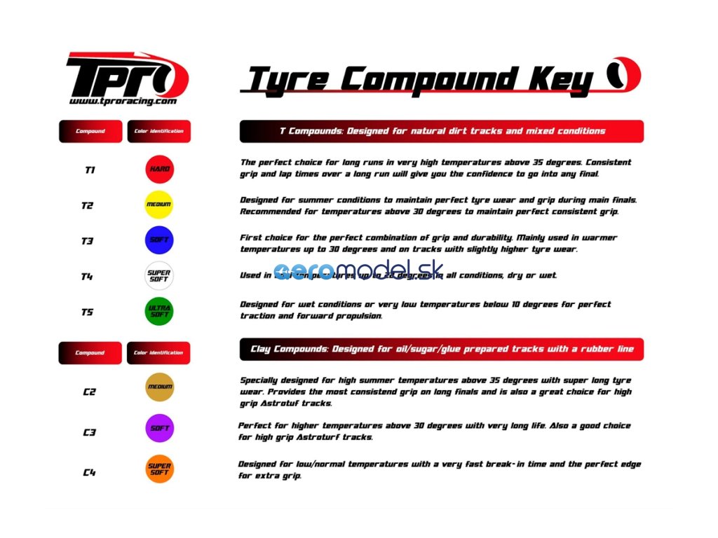 Směs ZR nabízíme v tvrdostech T2-Medium, T3-Soft a T4-Super Soft. Pomocí vhodných přísad je směs ZR k dispozici také v hliněné variantě v tvrdostech C3-Soft a C4-Super Soft. A konečně pro extrémně vlhké a mokré podmínky máme variantu Wet v provedení W5-Ultra Soft. Můžete si tedy vybrat z více než 60 různých pneumatik TPRO. Pro každé použití se tak jistě najde ideální pneumatika.