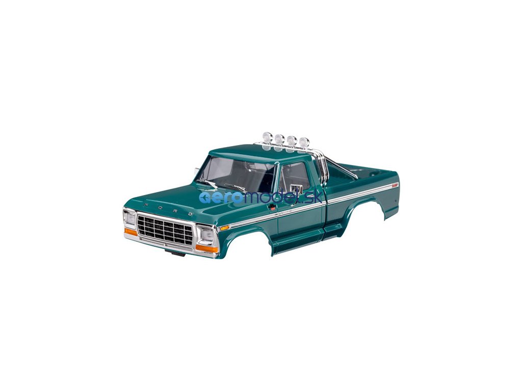 Traxxas karosérie Ford F-150 1979 zelená, pro RC model auta TRX-4M s delším rozvorem 162 mm (High Trail). Bez-sponková karoserie v měřítku 1:18 z ABS, kompletní, včetně mřížky chladiče, zrcátek, klik dveří, ochranného rámu, stěračů, bočních lišt a dalších detailů. Vyžaduje přední a zadní nárazník TRA9834.