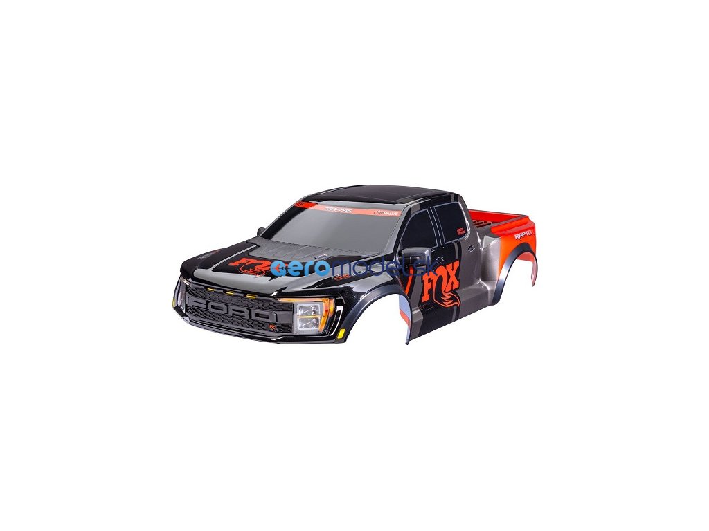 Karosérie Traxxas Ford F-150 Raptor R Fox, kompletní. Včetně mřížky chladiče, zadního panelu kufru, bočních zrcátek, masky oken a archu samolepek. Určeno pro montáž na bezsponkový systém uchycení Traxxas - TRA10124 a TRA10125. Není určená na modely Slash.