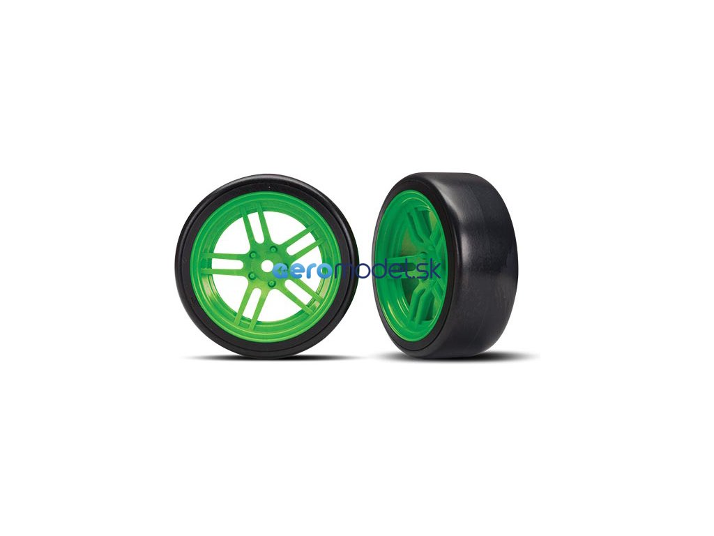 Kompletní přední kola pro RC modely auta Traxxas 4-Tec 2.0. Zelené disky Split-spoke s pneumatikami Drift (2 ks v balení).
