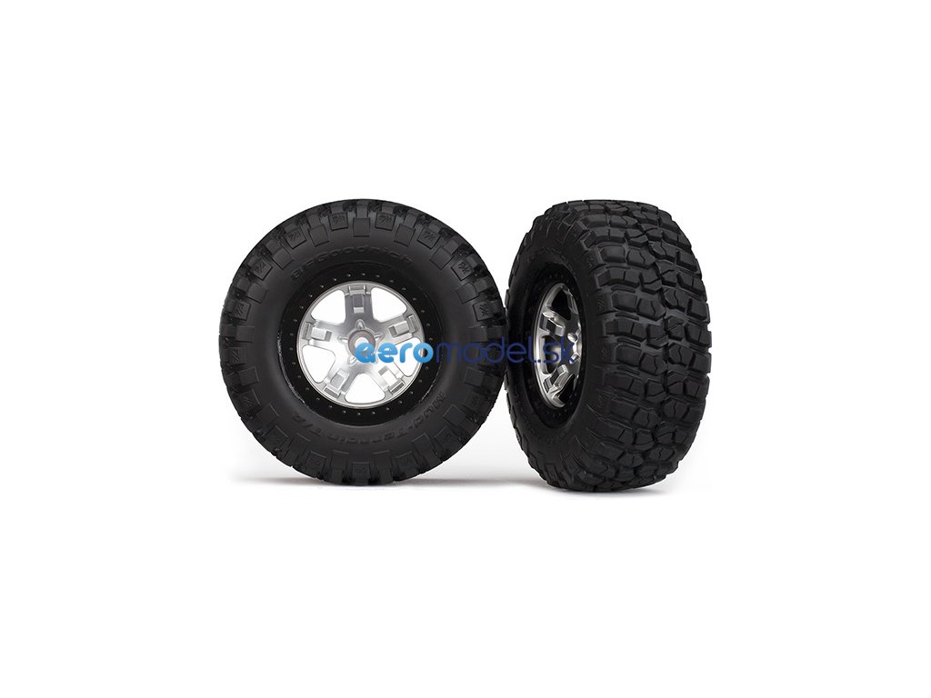 Kompletní zadní kola pro 2WD, přední i zadní kola pro 4WD auta Traxxas Slash. Stříbrné disky s černými ráfky nalepenými pneumatikami BFGoodrich® KM2 a vložkou.