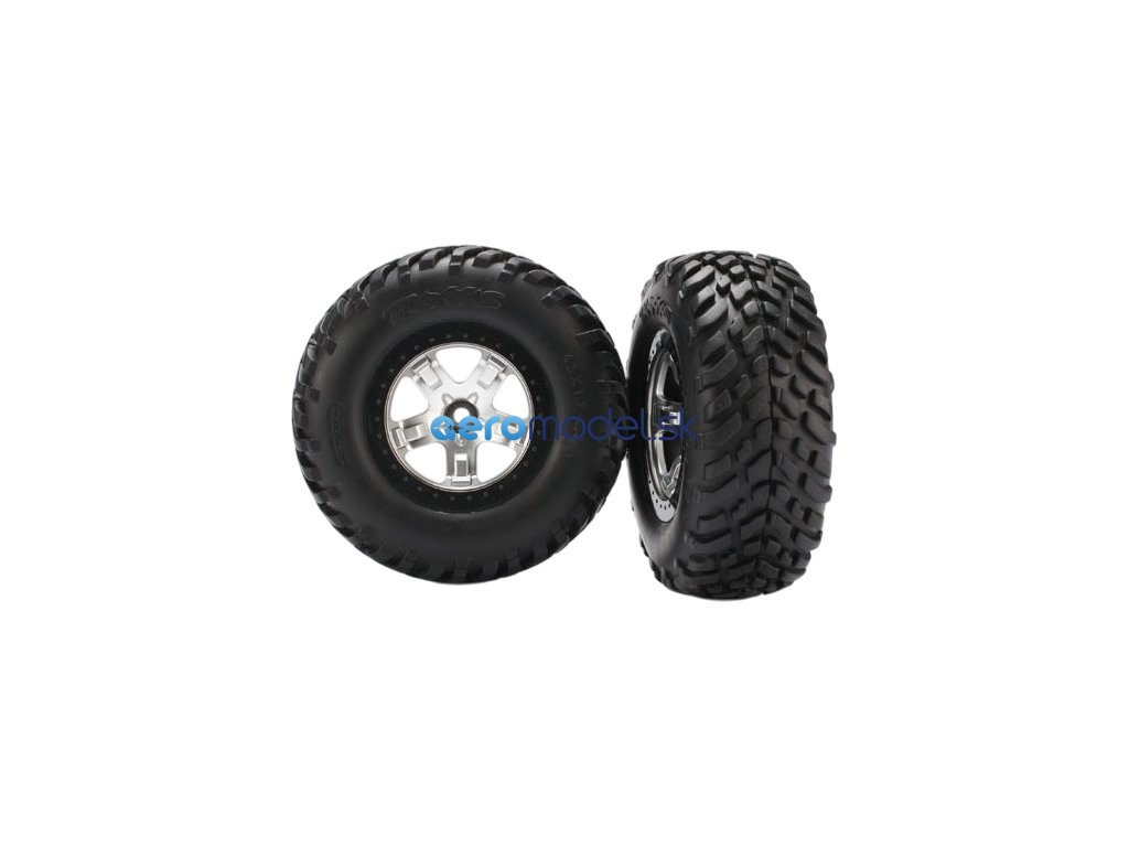 Kompletní přední kola pro 2WD auta Traxxas Slash. Stříbrné disky s černými ráfky a nalepenými pneumatikami Off-Road s vložkou. Rozměr disku 61/81x42 mm.