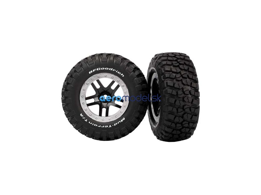 Kompletní zadní kola pro 2WD, přední i zadní kola pro 4WD RC auta Traxxas Slash. Disky Split Spoke černé se stříbrnými ráfky, nalepené pneumatiky Goodrich KM2 Mud Terrain.