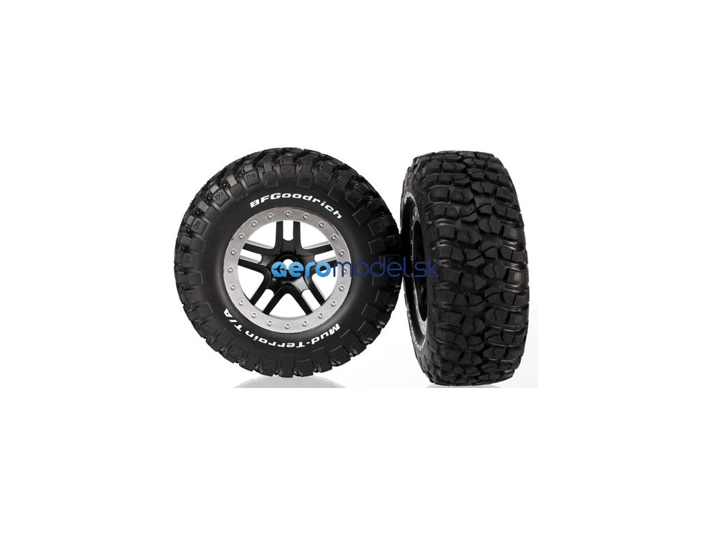 Kompletní přední kola pro 2WD pro RC auta Traxxas Slash. Disky Split Spoke černé se stříbrnými ráfky, nalepené pneumatiky Goodrich KM2 Mud Terrain.