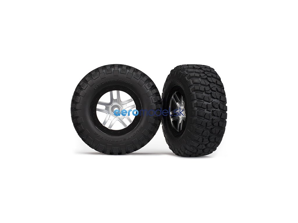 Kompletní přední kola pro 2WD auta Traxxas Slash. Černé disky s nalepenými pneumatikami BFGoodrich® KM2 a vložkou.