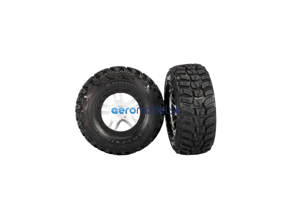 Kompletní univerzální kola pro RC auto Traxxas Slayer. Saténové disky s černými ráfky Bed Lock s nalepenými pneumatikami Kumho z ultra měkké směsi (S1) a vložkou.