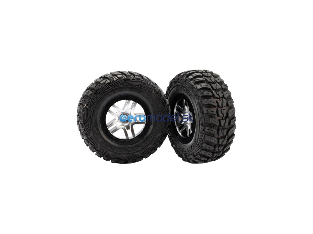 Kompletní přední kola pro 2WD auta Traxxas Slash. Saténové disky Split-Spoke s černými ráfky a nalepenými pneumatikami Kumho a vložkou (super měkká směs).