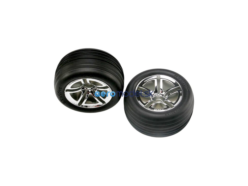 Kompletní přední kola pro RC auta. Chromované disky Twin Spoke s nalepenými pneumatikami Ribbed a vložkou.