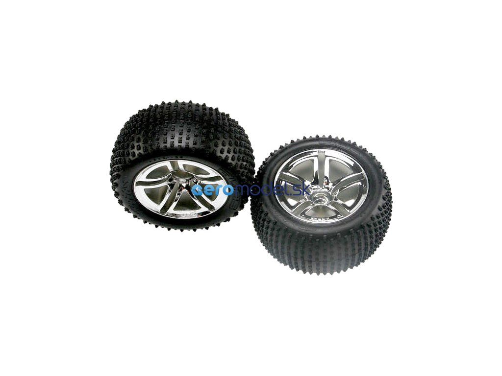 Kompletní kola pro RC auta. Chromované disky Twin Spoke s nalepenými pneumatikami Alias a vložkou.