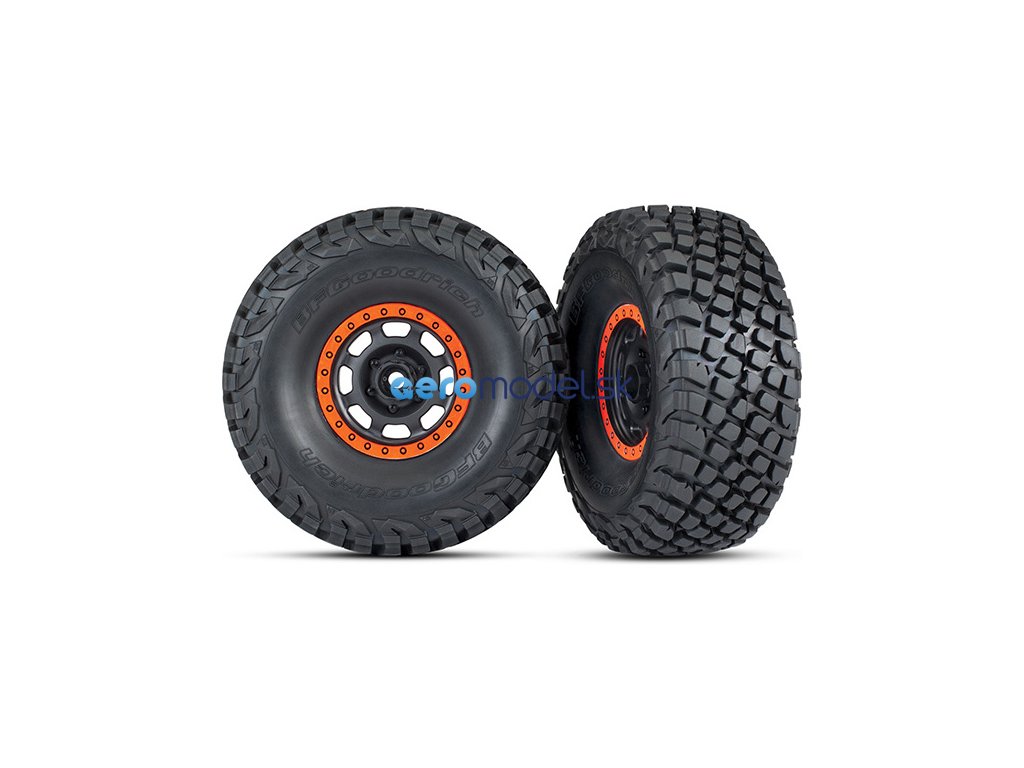 Kompletní univerzální kola pro Traxxas Unlimited Desert Racer. Disky Desert Racer® v černém provedení s oranžovými ráfky a pneumatikami Baja KR3 (2 ks v balení).