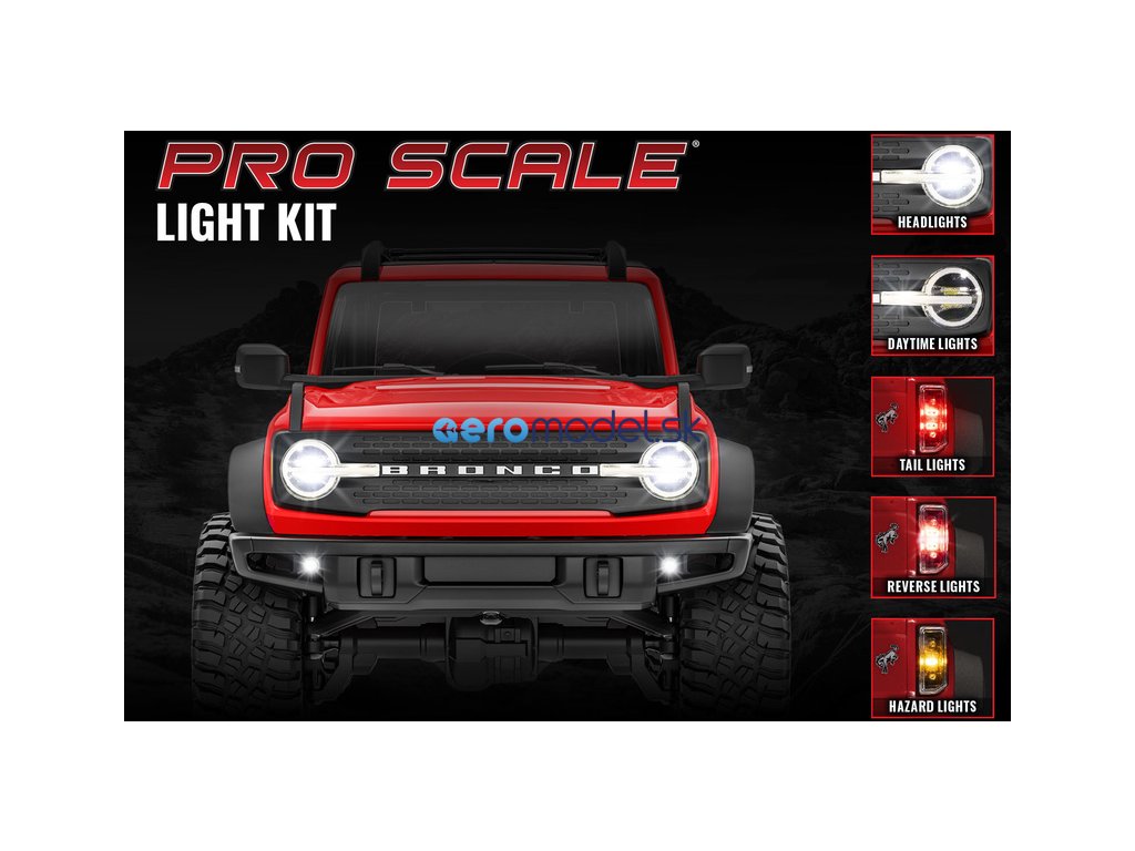Sada osvětlení ProScale přidává k modelu TRX-4M Ford Bronco 2021 přední světlomety, koncová světla, funkční brzdová a zpátečková světla, výstražná světla. Instalace je velmi jednoduchá. Stačí upevnit světla a zapojit je do řídící jednotky ECM-2.5, která je již předprogramovaná. Pro maximální jednoduchost jsou světla spojena jediným kabelovým svazkem se sběrnicí. Jako zbytek modelu je i toto osvětlení koncipováno jako voděodolné*.