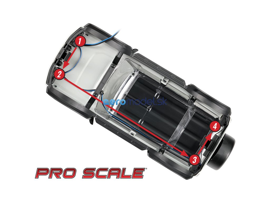 Funkce osvětlení Pro Scale je již zabudována do jednotky ECM-2.5 v modelu, takže není třeba instalovat další moduly. Stačí jen přidělat jednotlivá světla, která jsou vedena jedním kabelem. Kromě osvětlení Pro Scale můžete dokonce použít standardní nárazníková světla.
