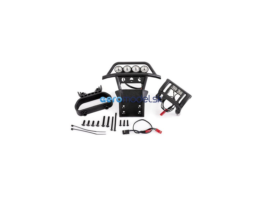 Balení obsahuje přední a zadní nárazník s LED osvětlením, držák nárazníku, Y-kabel pro zapojení do přijímače, montážní příslušenství. Manuál EN, DE, FR, SP.
