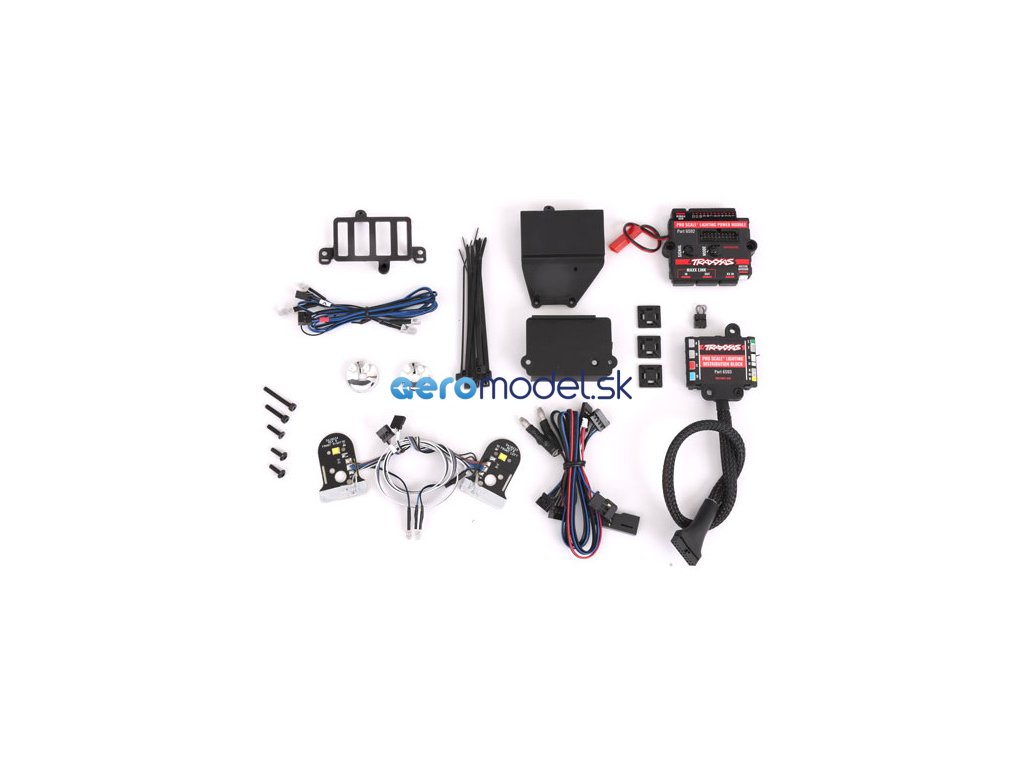 Balení obsahuje Pro Scale napájecí řídící modul LED, rozvodný modul LED, držák modulu, kabely senzoru motoru, propojovací kabel s přijímačem, propojovací Maxx kabel s přijímačem TQi, montážní příslušenství, komponenty LED osvětlení z instalační sady a LED světelné sady. Návod CZ a manuál EN, DE, FR, SP.