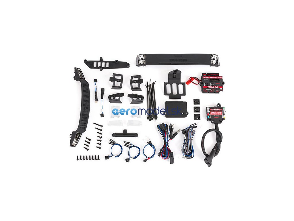 Balení obsahuje Pro Scale napájecí řídící modul LED, rozvodný modul LED, držák modulu, kabely senzoru motoru, propojovací kabel s přijímačem, propojovací Maxx kabel s přijímačem TQi, montážní příslušenství, komponenty LED osvětlení z instalační sady a LED světelné sady. Návod CZ a manuál EN, DE, FR, SP.
