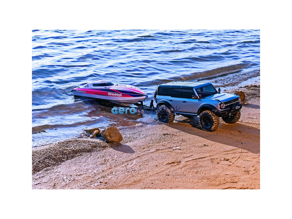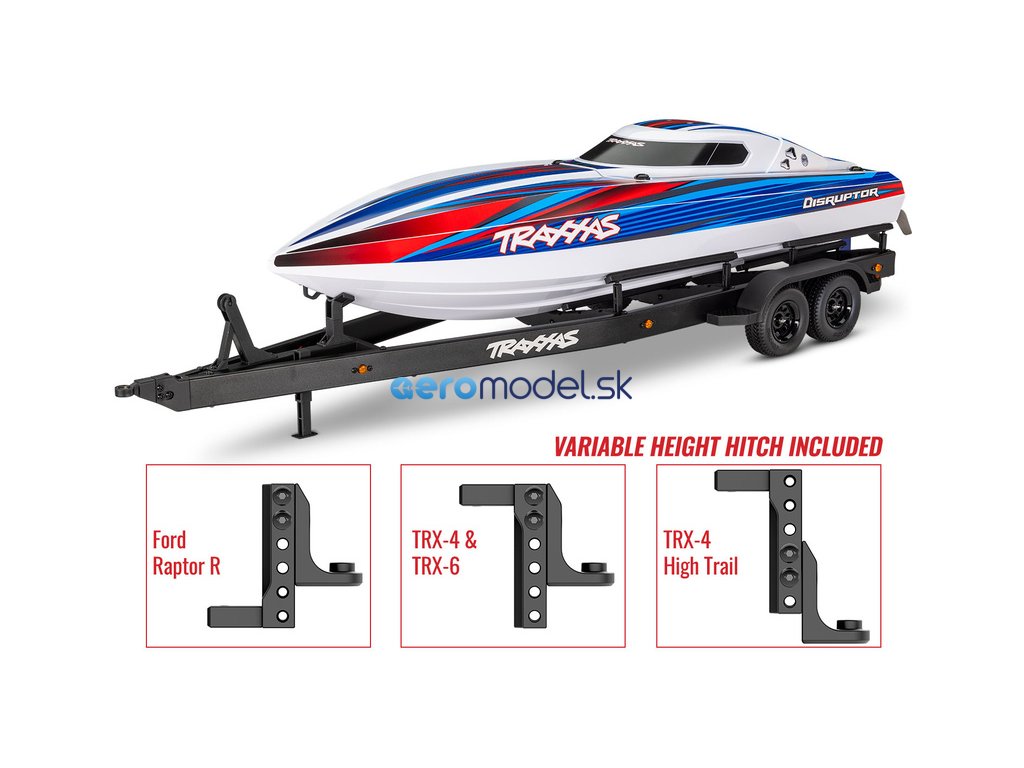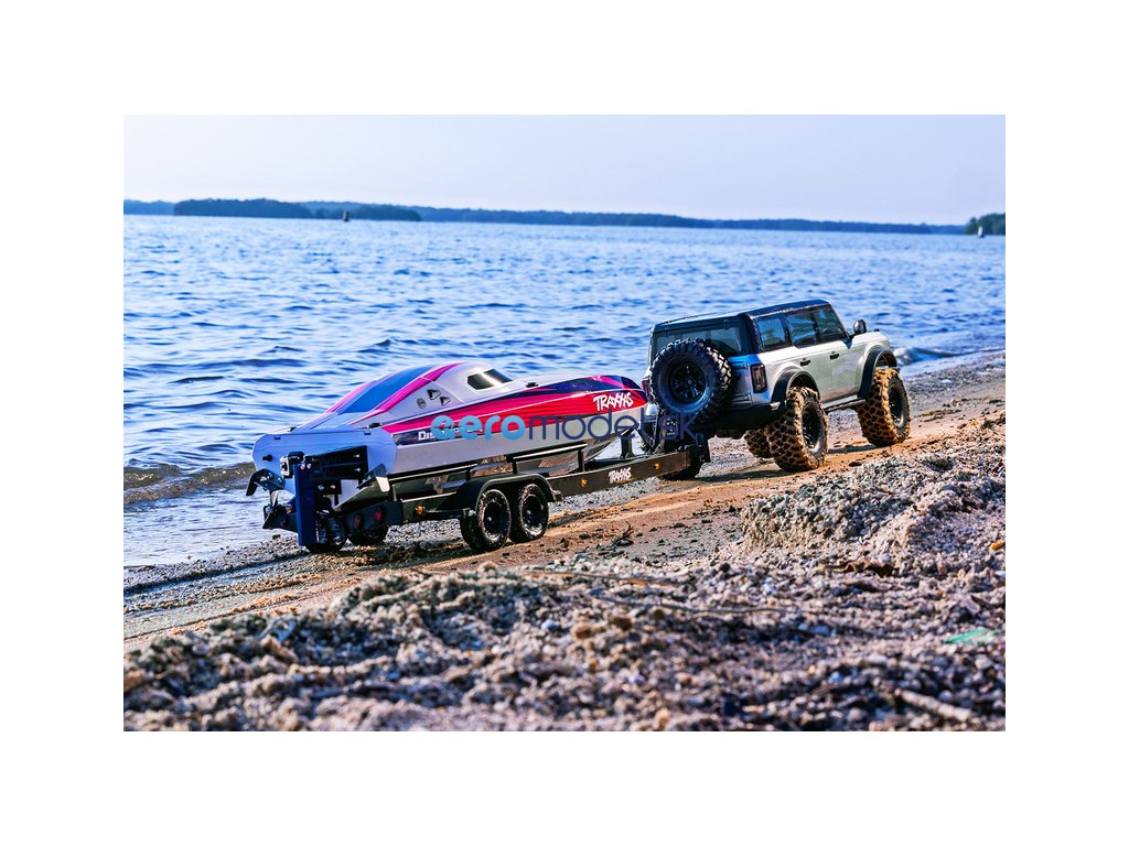 Přepravujte svůj člun Traxxas Disruptor k vodě stylově s detailním dvounápravovým přívěsem. Elastické úchyty bezpečně připoutají loď k lehkému hliníkovému rámu po celé délce přívěsu. Pomocí obsaženého výškově nastavitelného tažného zařízení můžete přívěs táhnout za RC modely aut Traxxas TRX-4 / TRX-6* (vč. High Trail) a Ford Raptor R. Můžete tak s lodí na přívěsu zacouvat přímo do vody.