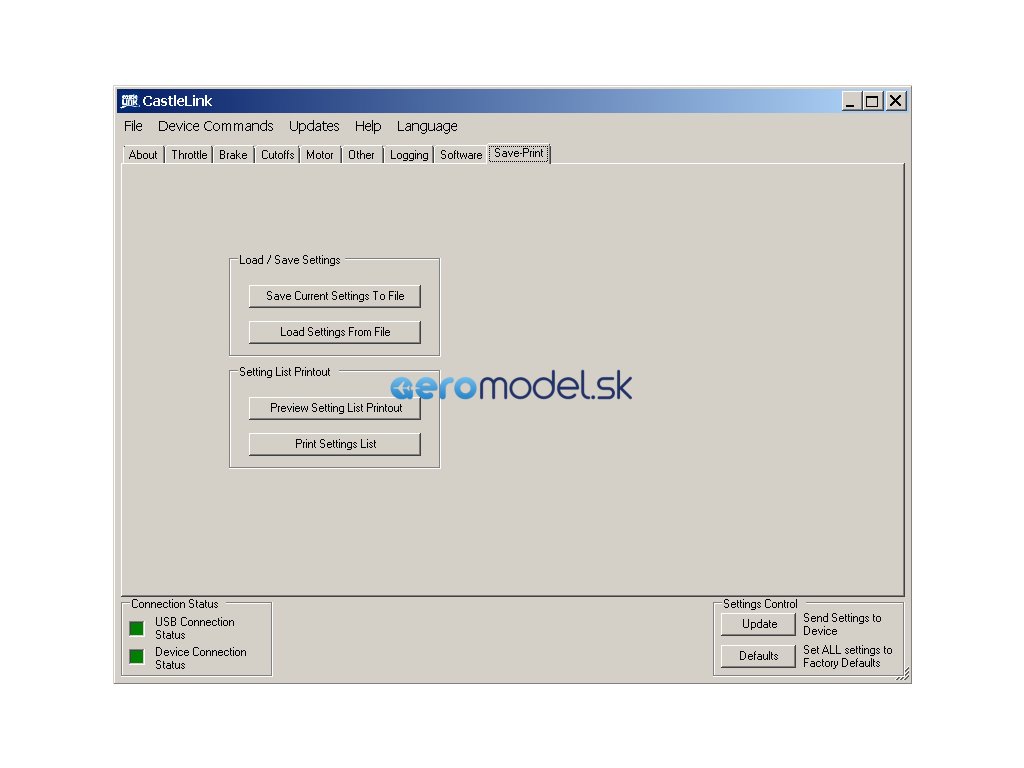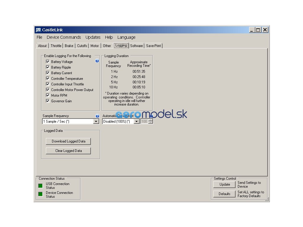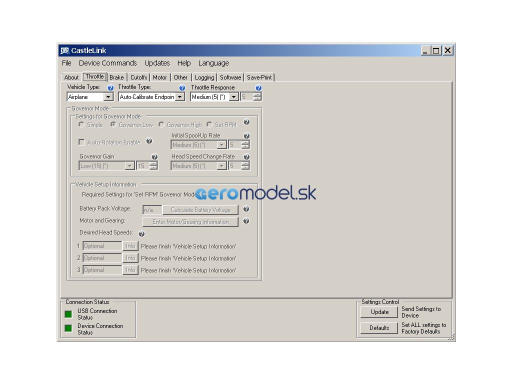 Základní parametry regulátoru lze naprogramovat pomocí plynové páky vysílače nebo programovací kartou. Veškeré parametry regulátoru se pak programují volně dostupnou aplikací Castle Link určené na počítače s operačním systémem Windows. Regulátor se připojuje k počítači přes speciální převodník do USB portu. Pro snazší připojení USB převodníku doporučujeme zakoupit programovací propojku Quick Connect.