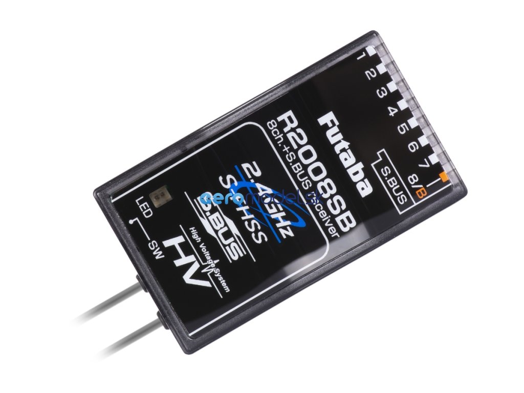 Osmikanálový přijímač Futaba přenosového systému S-FHSS/FHSS 2.4GHz bez telemetrie s dvojicí diverzitních antén s plným dosahem. Je určen pro všeobecné použití v modelech všech kategorií; díky kompaktním rozměrům, nízké hmotnosti a konektorům zasouvaným v podélné ose je vhodný i pro modely se štíhlým trupem, jako jsou větroně F3B, F3J apod. Kromě 8 PWM kanálových výstupů pro kalsická serva je přijímač vybaven portem S.BUS umožňující připojení S.BUS (a také S.BUS2) serv, gyroskopů a dalších S.BUS kompatibilních zařízení. Provozní stavy přijímače jsou signalizovány LED indikátorem.