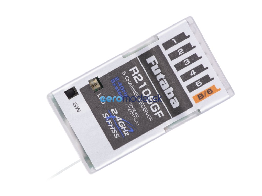 Šestikanálový přijímač Futaba přenosového systému S-FHSS/FHSS 2.4GHz bez telemetrie s omezeným dosahem. Je určen pro použití v malých a lehkých modelech letadel nevyžadujících velký dosah (park-flyerech a slow-flyerech) a podobných aplikacích. R2106GF je vybaven 6 PWM kanálovými výstupy pro klasická serva. Provozní stavy přijímače jsou signalizovány LED indikátorem.