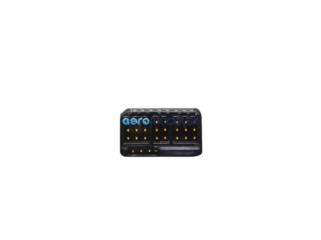 Přijímač je vybaven zdířkami pro standardní konektory Futaba (s výstupkem), do nichž je možno samozřejmě zasouvat i konektory UNI (=JR/Graupner, Hitec) bez bočního výstupku.