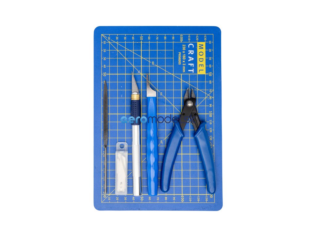 Modelcraft nářadí pro plastikové modely (sada 10ks) lze využít nejen při stavbě plastikových modelů. Obsahuje řezací podložku o rozměrech 230x160x3mm, modelářský nůž s hliníkovou rukojetí a náhradními čepelemi, plochý pilník, nástrojem na odjehlení hran a štípací kleště.