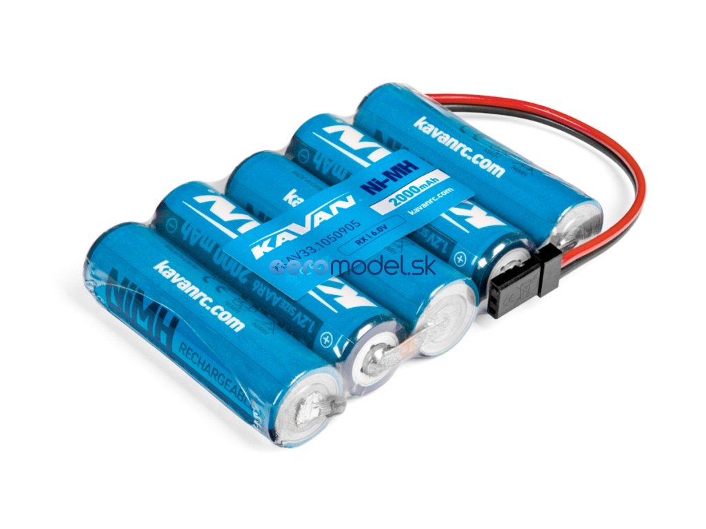 Pětičlánková přijímačová NiMH akumulátorová sada 6,0 V 2000 mAh s kabelem se servokonektorem JR/UNI. Články KAVAN 1.2V 2000 mAh s nízkým samovybíjením, max. vybíjecí proud 6A, max. nabíjecí proud 1A. Uspořádání na plocho vedle sebe. Rozměry: 71,5x53,5x14,5mm. Hmotnost: 144 g.
