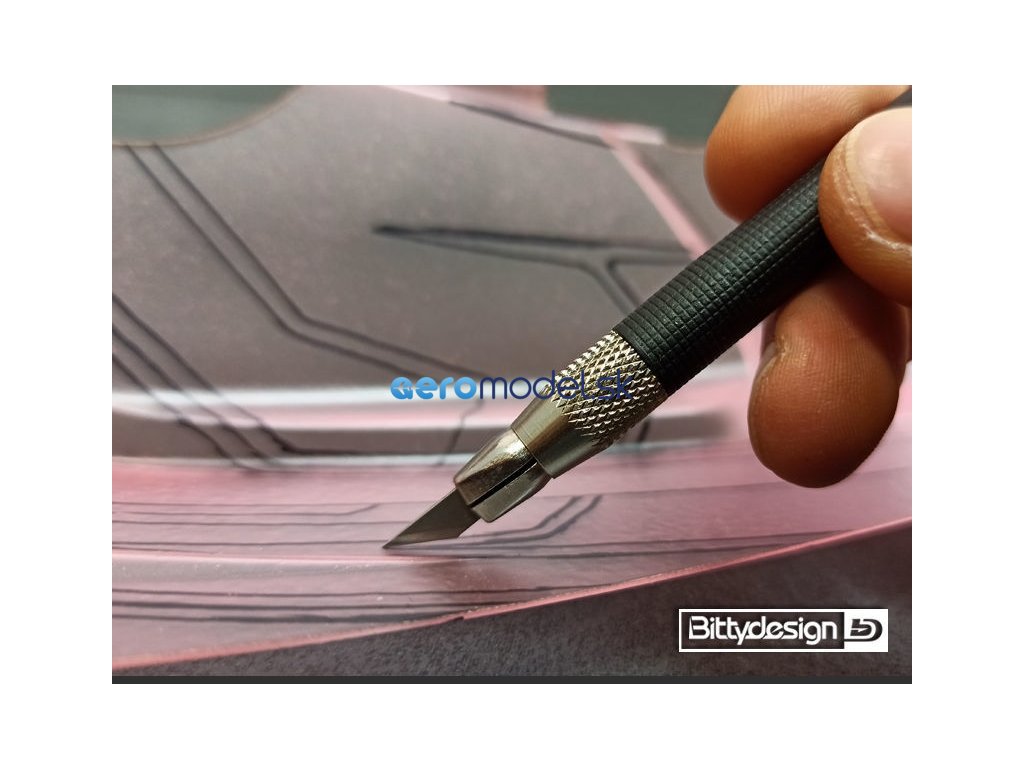 - plastová rukojeť s texturovaným designem pro lepší uchopení a ovládání, velmi lehká, která umožňuje řezat nejen tekutou masku, ale také provádět přesné řezy v uměleckých dílech, modelech, hobby, kutilství, dřevě, kartonu, tapetách, fóliích a tenkých plastových deskách, PVC vinylu... atd.