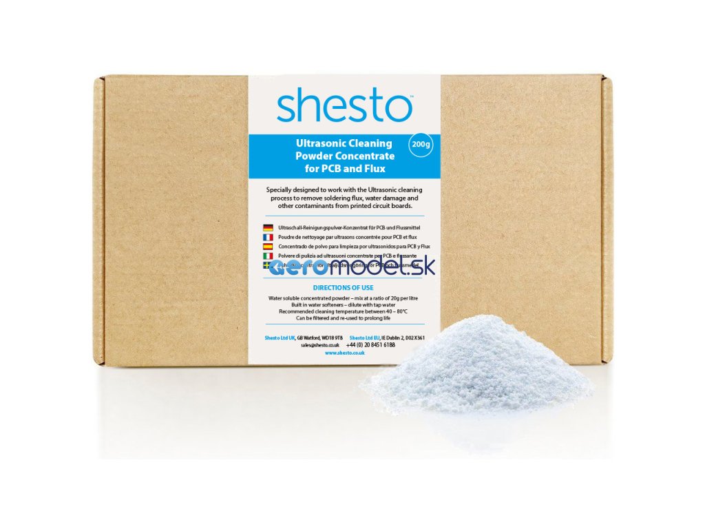 Speciálně navržený koncentrovaný prášek rozpustný ve vodě, pro ultrazvukové čištění k odstranění pájecího tavidla, oxidace a dalších nečistot z desek plošných spojů. Vytvoření až 10 l roztoku z 200 g koncentrátu. Pro prodloužení životnosti lze roztok filtrovat a znovu použít. Práškový koncentrát se oproti klasickým roztokům snáze skladuje.