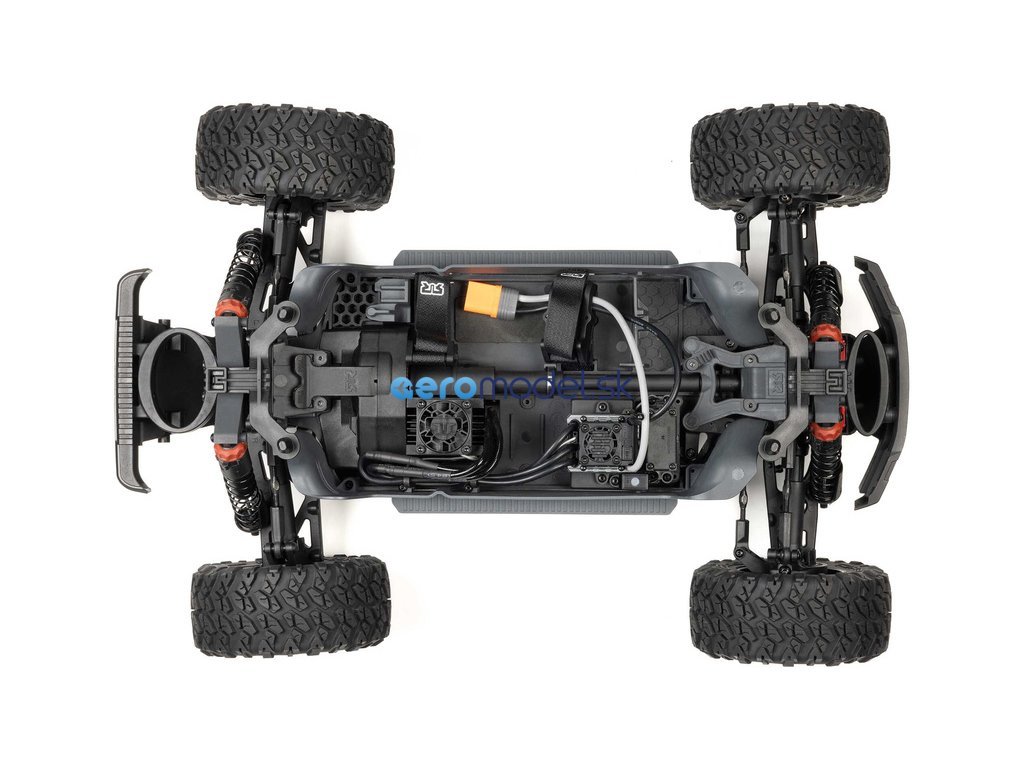 Osvědčená odolná platforma ARRMA® 4X4, vám umožní jezdit vysokou rychlostí téměř v jakémkoli prostředí - v terénu, na šotolině a trávě, na parkovištích i po zpevněných a asfaltových površích. Odolnost šasí vychází ze silného kompozitového podvozku, s prodlouženou výškou chráničů nečistot. Použité kovové převody jsou dostatečně odolné pro střídavý pohon. Výkon je distribuován na jednotlivá kola pomocí přední, zadního a středového diferenciálu. Maximální trakci zajišťují osvědčené pneumatiky dBoots. Vysílač Spektrum SLT poskytuje bezpečný provoz bez výpadků, pro bezstarostnou jízdu jsou na modelu použity voděodolné* komponenty - regulátor s přijímače Spektrum 2-v-1 80A a servo řízení Spektrum S662 s vysokým točivým momentem a kovovými převody.