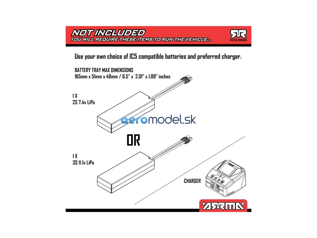 Model lze provozovat na 2 až 3 článkový LiPo akumulátor. Akumulátor by měl být osazen konektorem EC5 nebo IC5. Pro běžné ježdění doporučujeme 2 článkový LiPo akumulátor (7.4 V).