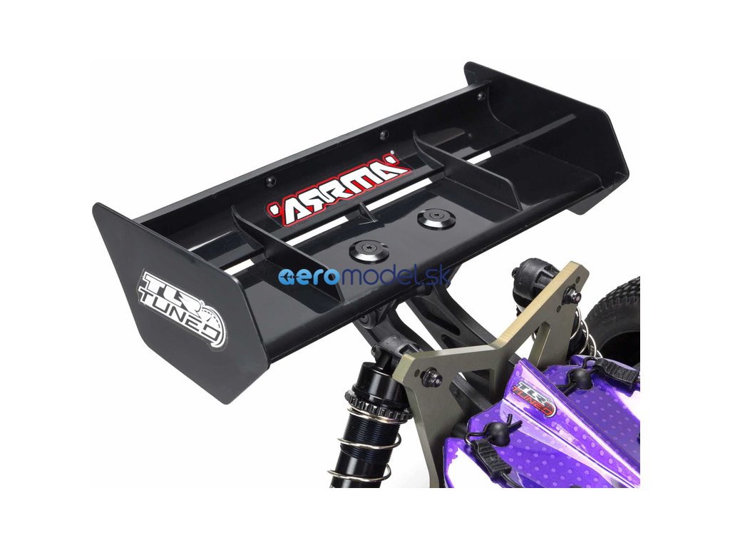 RC auto Arrma Typhon Tuned TLR má aj odolné hnacie ústrojenstvo, ktoré vydrží extrémne nárazy, s celokovovými diferenciálmi a ozubenými kolesami a odolnými oceľovými hnacími hriadeľmi. Jeho mimoriadne pevné náboje kolies podporujú nízkoprofilové kolesá na vyššej úrovni. Nastaviteľné zadné krídlo Race Spec pomáha udržať pneumatiky a buginu na zemi, čo prispieva k istému a citlivému ovládaniu pri vysokých rýchlostiach.