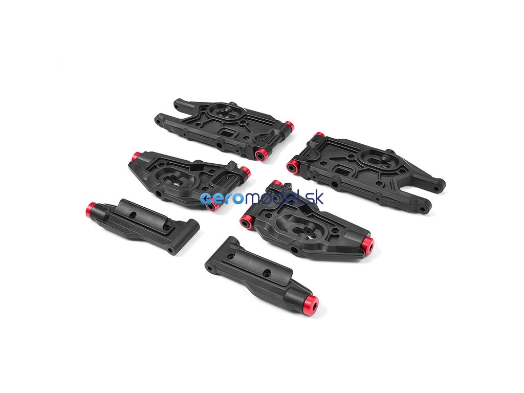 - Masivní kompozitová ramena zavěšení s vysokou odolností, s hliníkovými čepy závěsů a držáky otočných koulí pro působivou odolnost. Přední horní ramena jsou vybavena jedinečnou sadou pro aerodynamické řízení, která zajišťuje dodatečný přítlak a lepší odezvu řízení.
