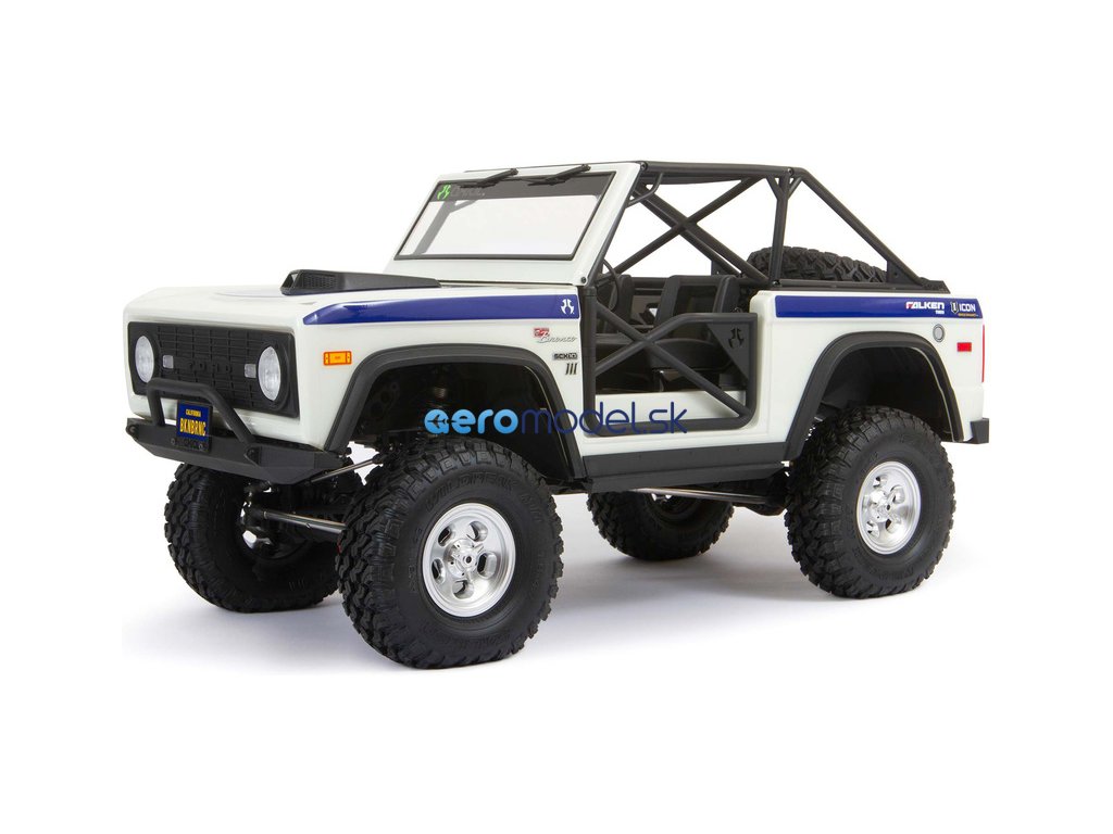Expedičný RC model Early Ford Bronco na podvozku Axial SCX10 III. Oficiálne licencovaná karoséria Early Ford Bronco s realisticky tvarovanou rúrkovou klietkou, funkčnými rámami dverí a množstvom autentických detailov. Prijímač Spektrum™ s funkciou SMART a regulátor s prijímačom poskytujú telemetrické údaje vysielaču DX3. Funkcia Front Dig na uzamknutie zadnej nápravy, servo, prijímač a regulátor Spektrum™ sú vodotesné.
